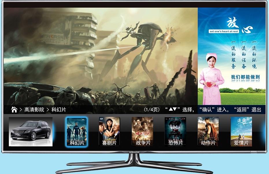 让您的品牌形象更好的展现给入院病人。在病人打开电视后,可以插播开机广告,随后进入主界面。左侧展示您指定的视频或是图片轮 播。