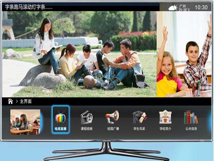 系统主界面拥有时尚设计,显示教室号、天气以及以学校为主题的宣传图片或视频,可以按时间设定多个图片切换,也可以换成视频宣传广告播放。所有模块均可自定义添加,互动电视系可以满足更多的个性化需求,比如强制插播,后台统计等,更好地适应信息简单易用的信息化教学。